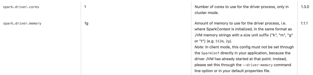 The main driver configurations to consider are the number of cores (spark.driver.cores) and the memory for the driver (spark.driver.memory). The default values for these configurations can be found below: