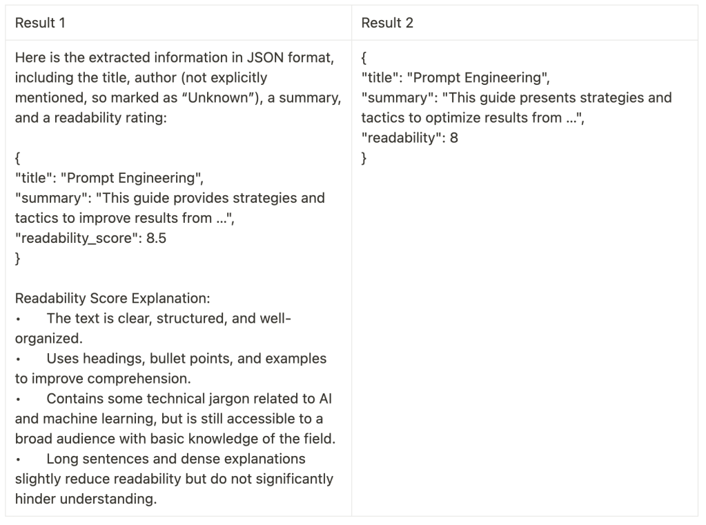 Including examples in your prompt significantly increases the likelihood of receiving responses in a specific format. If you require structured outputs such as JSON or Markdown, explicitly showing the expected format in the prompt helps guide the model’s response.